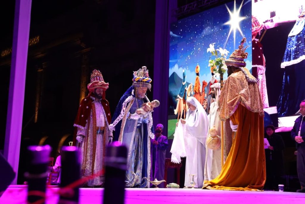 Acompañados de sus inseparables elefante, caballo y camello, los reyes Melchor, Gaspar y Baltazar, comenzaron su recorrido desde el santuario del Niño de Salud, escoltados por carros alegóricos que se sumaron a la cabalgata.