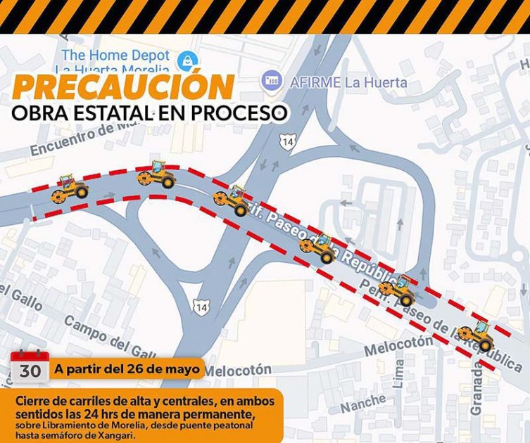 Morelia, Michoacán, 25 de mayo de 2025.- La Secretaría de Comunicaciones y Obras Publicas (SCOP) informa que, derivado de la construcción del distribuidor vial de salida Pátzcuaro, se cerrarán de manera temporal los carriles de alta y media velocidad sobre el libramiento de Morelia en dicho polígono, a partir del lunes 26 de mayo del presente año.